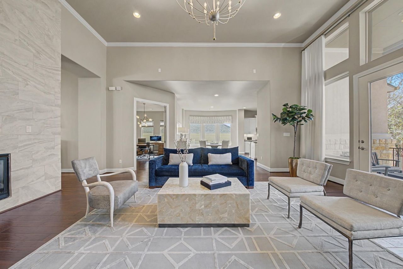 Showings begin Sat. 3/7, If you could come to tour during OPEN HOUSE This single-story home offers a functional layout & quality finishes throughout. The stone & stucco exterior is complemented by stone planters, a sleek wood garage door, full gutters, irrigation, and a new Class 4 hail-resistant roof. A gated front courtyard w/ tile flooring creates a welcoming entry.Inside is full of charm including hardwoods through the main living areas, soaring ceilings with tray ceiling details, crown molding, wood shutters, and upgraded fixtures & lighting for a clean, finished look.Upon entry youll find a massive dining room with chandelier and floor to ceiling tile wrapped wall, which opens into the open living area w/ a statement chandelier, gas fireplace, and wall of frameless windows overlooking the backyard.The spacious kitchen boasts a large breakfast area w/ bay window, an oversized eat-up center island, granite counters, deep single-basin sink with gooseneck faucet, 5 burner gas cooktop, pot filler, double built-in ovens & microwave, stainless appliances, crown molding on uppers & 3 frameless windows above the sink with backyard views. The large private study w/glass French doors & Sputnik chandelier is just off the breakfast area. A private guest wing is located to the left of the entry & includes 3 spacious bedrooms & 2 baths - one of which is an ensuite with a chandelier?all with walk-in closets. A half bath is also located near the dining room.The primary suite offers patio access, tray ceilings, and a seating area. The spa-like bath includes dual vanities flanking a makeup area, marble flooring, a herringbone tiled wall at the soaking tub, walk-through shower with bench & window, linen closet, and a large walk-in closet.Additional features include an oversized laundry room w/cabinetry & room for an extra fridge, mudroom drop zone at garage entry, 3-car tandem garage, select tinted windows, extra storage, and a water softener loop.