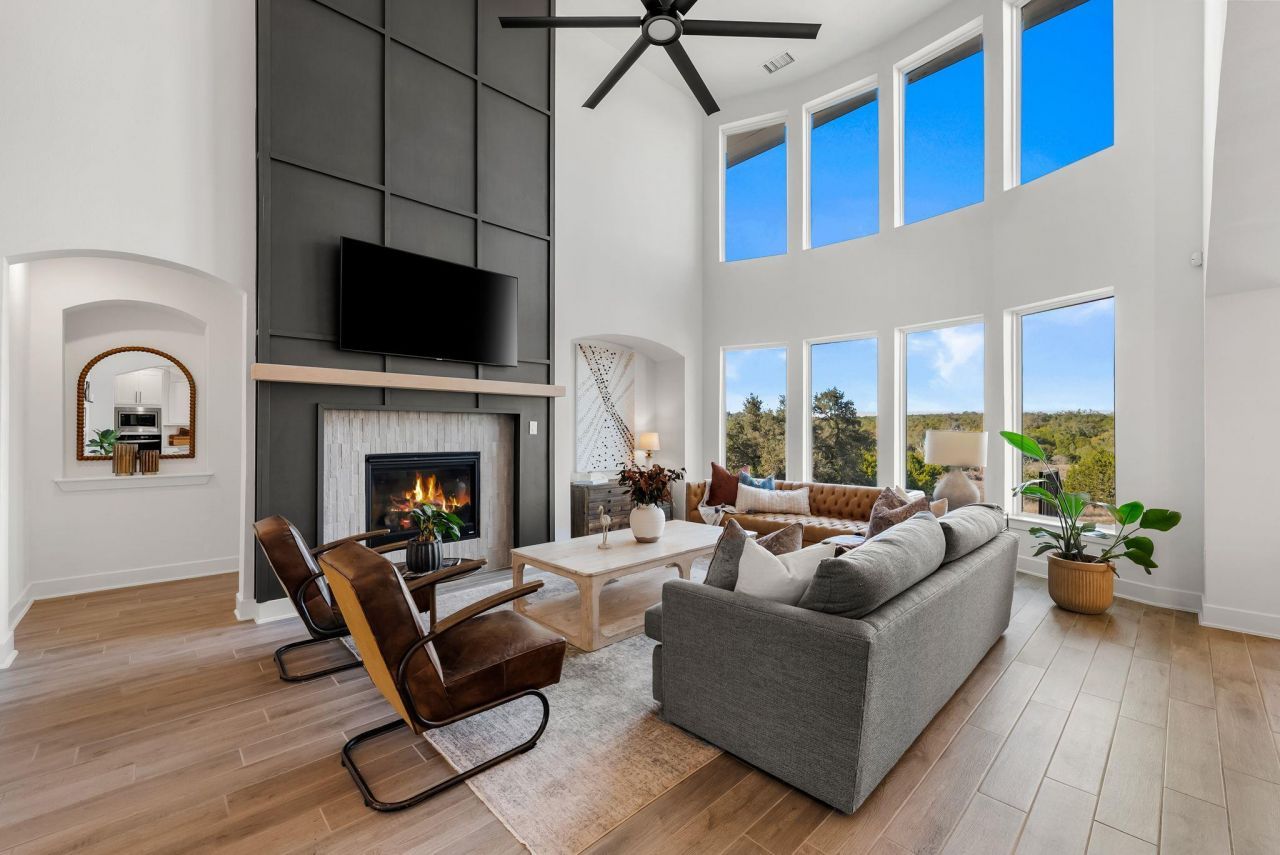 This is the kind of home you move to the Hill Country for. Set on a 70' foot greenbelt lot in Provence, this 5 bedroom, 4.5 bath home offers privacy, sweeping views, and a flexible layout designed for both everyday living and entertaining. From the moment you step inside, the curved staircase and soaring ceilings create a striking first impression, while expansive windows fill the space with natural light.The open living area is anchored by a dramatic floor to ceiling fireplace and flows seamlessly into the kitchen and dining space. The kitchen features an oversized island, quartz countertops, abundant cabinetry, and elevated designer finishes that balance style and function.The main level includes a dedicated study, a private primary suite, and a separate guest retreat tucked away from the main living areas. Ideal for extended stays or a quiet secondary office, this retreat adds versatility to the floor plan. The primary suite overlooks the greenbelt and features dual vanities, a freestanding soaking tub, and a spacious walk in shower. Upstairs, three additional bedrooms surround a spacious loft and a dedicated media room, creating the perfect setup for movie nights or a secondary living space. Step outside to the covered balcony overlooking the greenbelt and rolling Hill Country landscape. The backyard has plenty of room for a pool, and the three car garage adds extra storage. Located in Provence, residents enjoy scenic walking trails, a resort style pool, and convenient access to the Hill Country Galleria, dining, and Lake Travis ISD schools. You won't find any remaining new build options of this quality!