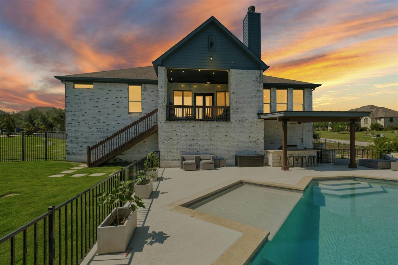 Discover refined Hill Country luxury living in this stunning 4-bedroom, 3-bath home located in the exclusive Vistancia subdivision. Thoughtfully designed with a balance of elegance, comfort, and functionality, this residence offers an exceptional lifestyle.The open-concept layout showcases rich hardwood floors, soaring vaulted ceilings with wood beams, and expansive windows that flood the home with natural light. A gourmet kitchen featuring stainless steel appliances and a large center island flows seamlessly into the spacious living area?perfect for hosting gatherings or enjoying family time.Work or study with ease in the custom-built office with dual workstations, then unwind in the dedicated media room, designed to bring the full cinematic experience right to your home.Step outside to your private resort-style retreat: a sparkling pool, covered outdoor kitchen and bar, and multiple lounge areas designed for entertaining or simply soaking in the serene Hill Country views?all complemented by the advantage of low HOA fees and property taxes.