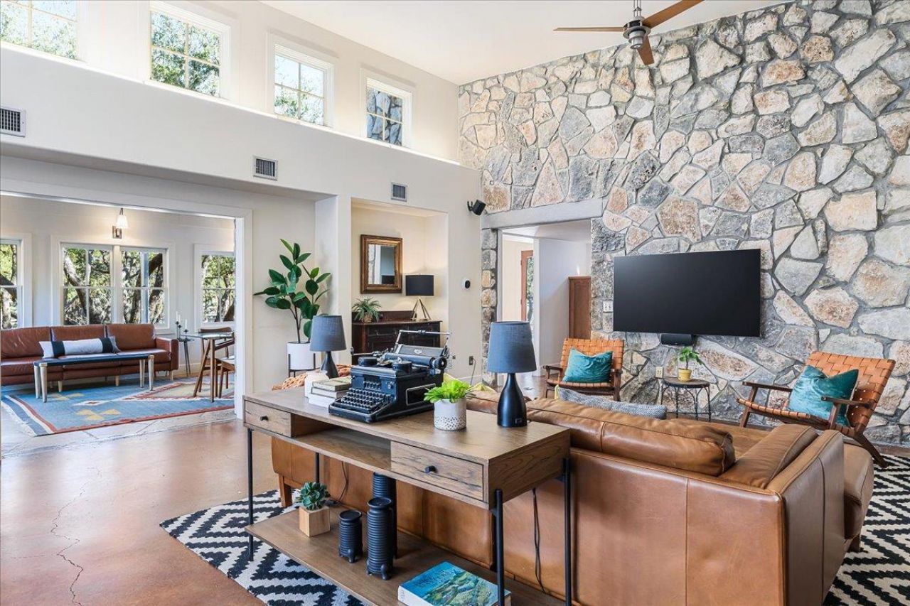 Designed for multi-generational living, the property features two homes: an ADA-compliant 2,796 sf main home with 3 bedrooms, 3 baths, 3 living areas, captivating stonework, and a distinctive architectural personality as well as a 2 bed/2 bath 1,493 sf log cabin rich with warmth & character (with its own laundry hookups). All with a low 1.7% tax rate and no HOA! For artists, makers, and hobbyists, a dedicated studio offers space to create or as a home office. For homesteaders, the acreage supports substantial gardens, chickens, and a more self-sufficient rhythm of life. Tucked among majestic oak trees in the heart of Spicewood, this gated Hill Country homestead & artist retreat blends privacy, proximity, & possibility ? all within the Lake Travis ISD & just a 3-minute drive from a coming soon new LTISD high school. Whether you envision a legacy estate, guest quarters for extended stays, or a savvy income-producing setup (short- or long-term rental), the flexibility is compelling. Bridges spanning a wet-weather creek, a stone cistern, and layers of mature trees across the three-acre property create a secluded, storybook setting. Expansive decking and a fire pit set the stage for evenings under Hill Country stars, while a large shed provides additional storage. For entrepreneurs, the highway location offers visibility and convenience for a small or non-retail business without sacrificing privacy. Its the best of both worlds: tucked away, yet not remote, in a rapidly growing corridor just west of Austin. Enjoy a 20-minute drive to the Hill Country Galleria and H-E-B, equal distance to Marble Falls and Bee Cave, easy day trips to Fredericksburg, San Antonio, and nearby wineries, and approximately 40 minutes to downtown Austin. A true jumping-off point for the Hill Country lifestyle - where land, location, and long-term potential converge. Don't miss the chance to own this beautifully versatile property in one of Central Texas most dynamic growth corridors.