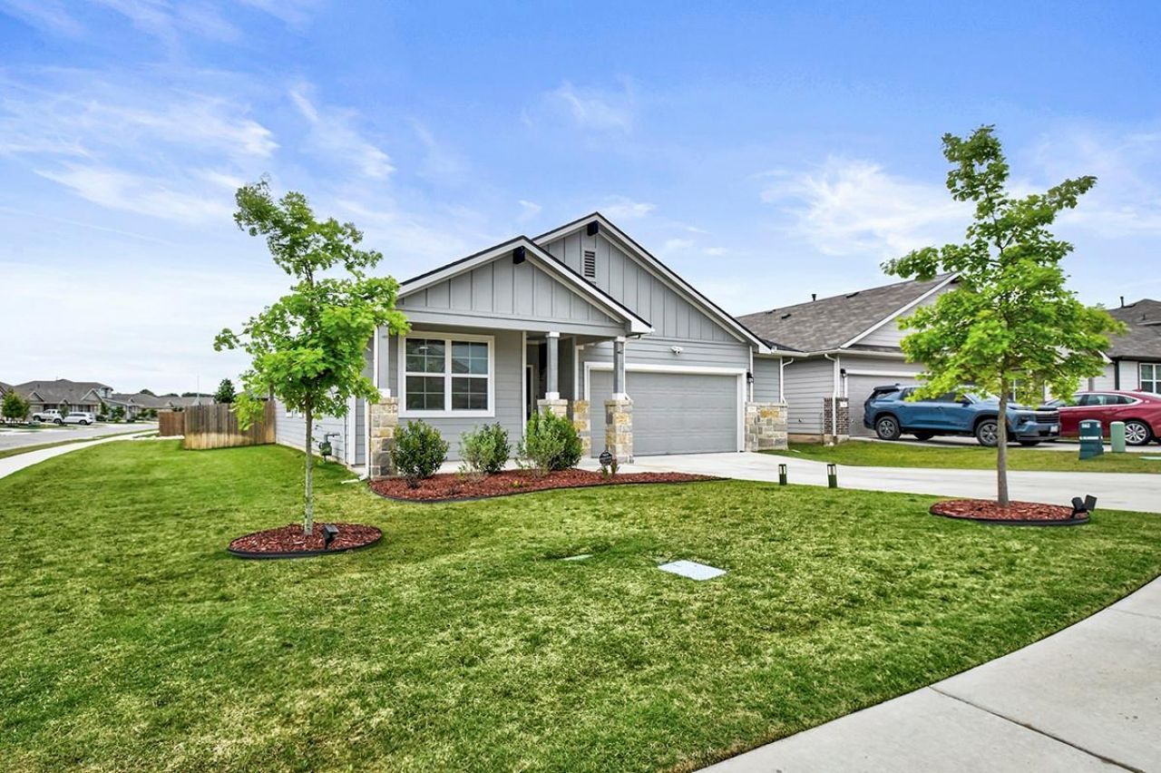 Welcome to this beautiful single-story residence, gracefully situated on a premium lot within Mustang Creek community in Hutto, TX. Encompassing 1,853 square feet, this thoughtfully designed home offers an exceptional blend of comfort, style, and refined living. Upon entry, you are greeted by a light-filled foyer that sets the tone for the homes airy and sophisticated ambiance. Soaring ceilings and upgraded flooring extend throughout the main living areas, creating a seamless flow that is inviting. At the heart of the home lies a modern kitchen, complete with an expansive wrap-around island, sleek white quartz countertops, and white shaker cabinetry, perfectly suited for both everyday living and entertaining. The main living area is enhanced by a striking custom accent wall, adding a touch of character and design while maintaining a bright, open atmosphere. This space effortlessly connects to the covered patio, offering a natural transition for indoor and outdoor living.Positioned on a premium lot, the backyard provides ample space for recreation and relaxation, while the covered patio invites gatherings, quiet mornings, or evenings for unwinding. The primary suite is thoughtfully set apart, creating a private retreat featuring dual spacious closets custom-designed for optimal organization and style. The en-suite bath exudes comfort with a quartz-topped double vanity and a walk-in shower. Three additional bedrooms offer versatility, ideal for guests, family, or a dedicated home office. Ideally located with convenient access to HEB, Walmart, Chick-fil-A, Jack Allens Kitchen, Starbucks, Hooky Entertainment Hutto, Old Settlers Park, and more, this home offers both tranquility and accessibility. Schedule your private showing today!