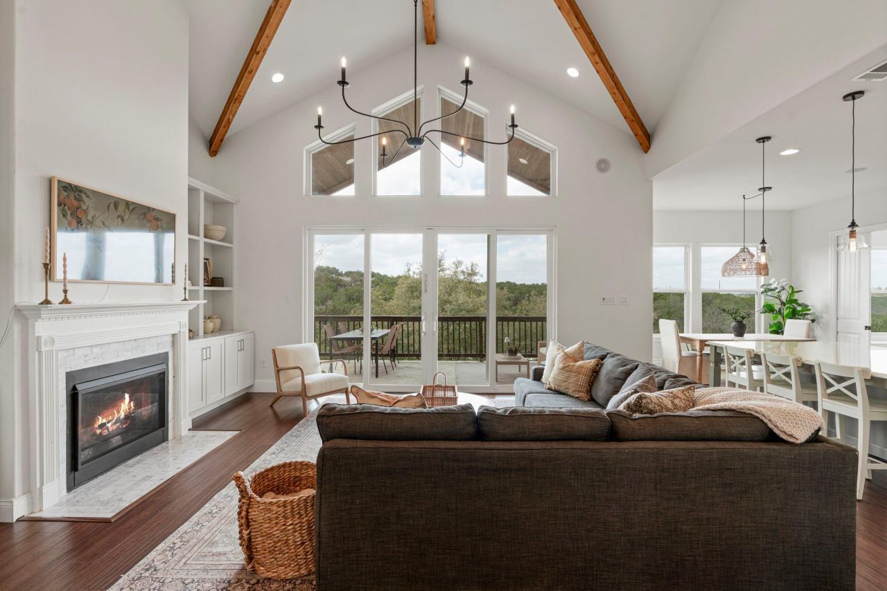 Set on over one acre in the coveted Sawyer Ranch community, this beautifully remodeled home captures breathtaking long-distance Hill Country views while blending thoughtful design with todays modern living. Inside, soaring ceilings, exposed beams, and expansive windows create a bright and inviting living space anchored by custom built-ins and a gas-log fireplace. Sliding doors frame the sweeping landscape and open onto a generous covered deck, perfect for enjoying incredible sunsets and the surrounding Hill Country scenery. The fully updated kitchen offers abundant cabinetry, stone countertops, a farmhouse sink, marble backsplash, stainless appliances, double ovens, gas range with pot filler, and a walk-in pantry with exceptional organization. A separate scullery adds additional storage and prep space. The main-level guest suite has built-ins, Elfa closet shelving, and an updated en-suite bath. Additional main-floor spaces include a formal dining room with tray ceilings and chandelier, a dedicated office nook, and a playroom off the kitchen with plantation shutters overlooking the property.Upstairs, the serene primary has tray ceilings, French doors, and a beautifully updated bathroom featuring dual vanities, soaking tub, walk-in shower, and a spacious walk-in closet. Enjoy sunset views from the private deck overlooking the expansive Hill Country landscape. A large laundry room with sink, linen storage, and a sizable attic with blown-in insulation and expansion potential. Two spacious secondary bedrooms and an updated bathroom complete the second floor. Additional highlights include hardwood floors, updated bathrooms, new HVAC and ductwork, full gutters, front irrigation, and a reverse osmosis AquaTru system. With 4 bedrooms, 3.5 baths, extensive updates, and sweeping Hill Country views from over an acre, this Sawyer Ranch property offers a rare combination of privacy, space, and refined Hill Country living. Enjoy the use of the community pool and nature paths!
