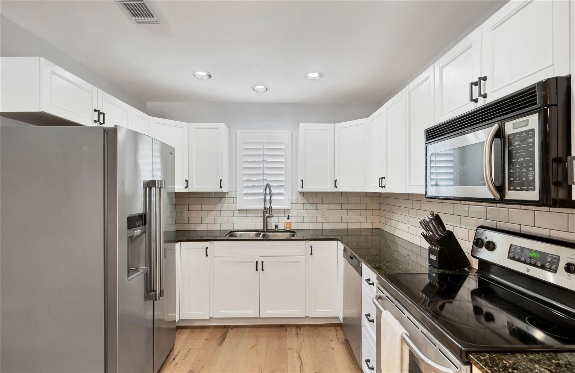 AWESOME LOCATION! Gorgeous, FULLY UPDATED, 2/2.5 gated condo in Tarrytown/78703. Quick access to entertainment, outdoor fun shopping, and downtown. On the first floor you'll find stylish updates like wide-plank light oak floors, built-in shelving, plantation shutters, recessed lighting and a bright kitchen with stainless steel appliances and stone countertops. Modern stair railings lead to two bedrooms, both with ensuite bathrooms with barn doors, cool tile, frameless glass showers with bench seats, and marble-top vanities. A combination washing machine/dryer was added in a hall closet, conveniently located between the 2 bedrooms (few units have laundry), as well as plantation shutters, double-pane windows, and a Nest thermostat. Condo comes with 2 DEDICATED PARKING SPOTS, one in gated garage, and one outside very near the side entry gate. HOA fee covers WATER & TRASH. All units open to courtyard which offers outdoor sitting areas. Across the street from West Austin Youth Association, Lions Municipal Golf Course; 3 blocks to the new HEB at Exposition/Lake Austin Blvd, .9 mile to Walsh Boat Landing on Lake Austin, Mozart's Coffee, Hula Hut; 1.2 mi to Deep Eddy pool, and a 6-minute drive to downtown Austin.