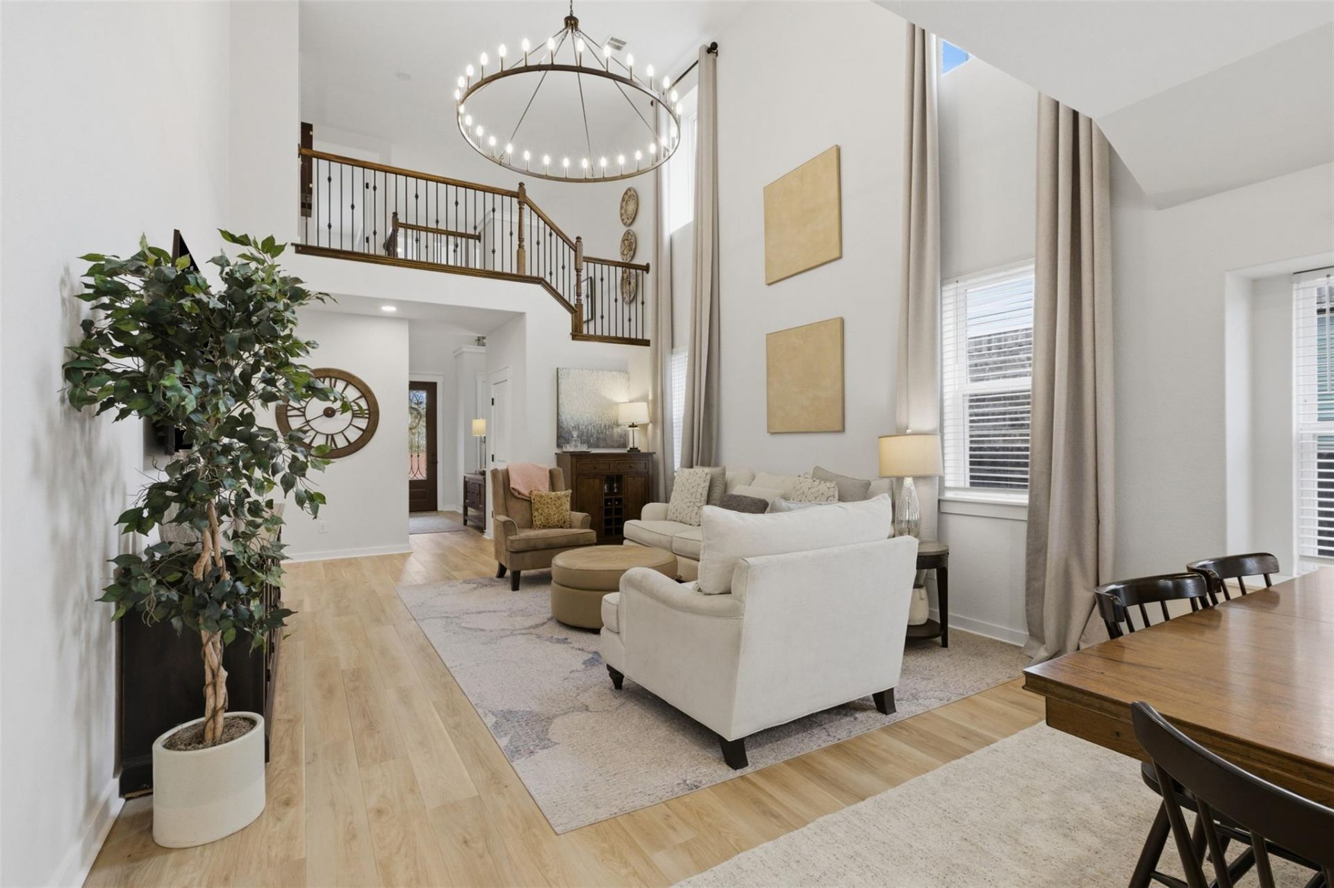 4 beds | 2.5 Baths | Large backyard | Soaring ceilings | Balcony | Oaks at San Gabriel Neighborhood |Stylish and beautifully maintained, this home in the desirable Oaks at San Gabriel neighborhood offers exceptional curb appeal with easy-to-maintain landscaping and a charming tree out front. Inside, an open floor plan showcases soaring ceilings, expansive windows, and gorgeous wood-look luxury vinyl plank flooring throughout the main living areas. The living room features a striking chandelier and flows seamlessly into the dining and kitchen spaces, where youll find quartz countertops, a center island with bar seating, elegant white cabinetry with pullout drawers, stainless steel appliances, and a spacious pantry. A convenient half bath tucked under the stairs on the main level adds extra functionality for guests. The primary bedroom provides a relaxing retreat with a walk-in closet with built-ins and an ensuite bath complete with a dual vanity and frameless glass shower. Upstairs, three additional bedrooms offer flexibility for guests, a home office, or hobbies?one even includes balcony access?and all share a well-appointed full bath. Step outside to a spacious fenced backyard with a covered patio and dedicated garden beds, plus plenty of room to add a pool. Residents enjoy access to fantastic community amenities including a pool, pavilion, parks, playgrounds, picnic areas, and scenic trails. Conveniently located near shopping, dining, and recreation, with easy access to Hwy 29, Hwy 183, and I-35, this home truly has it all.
